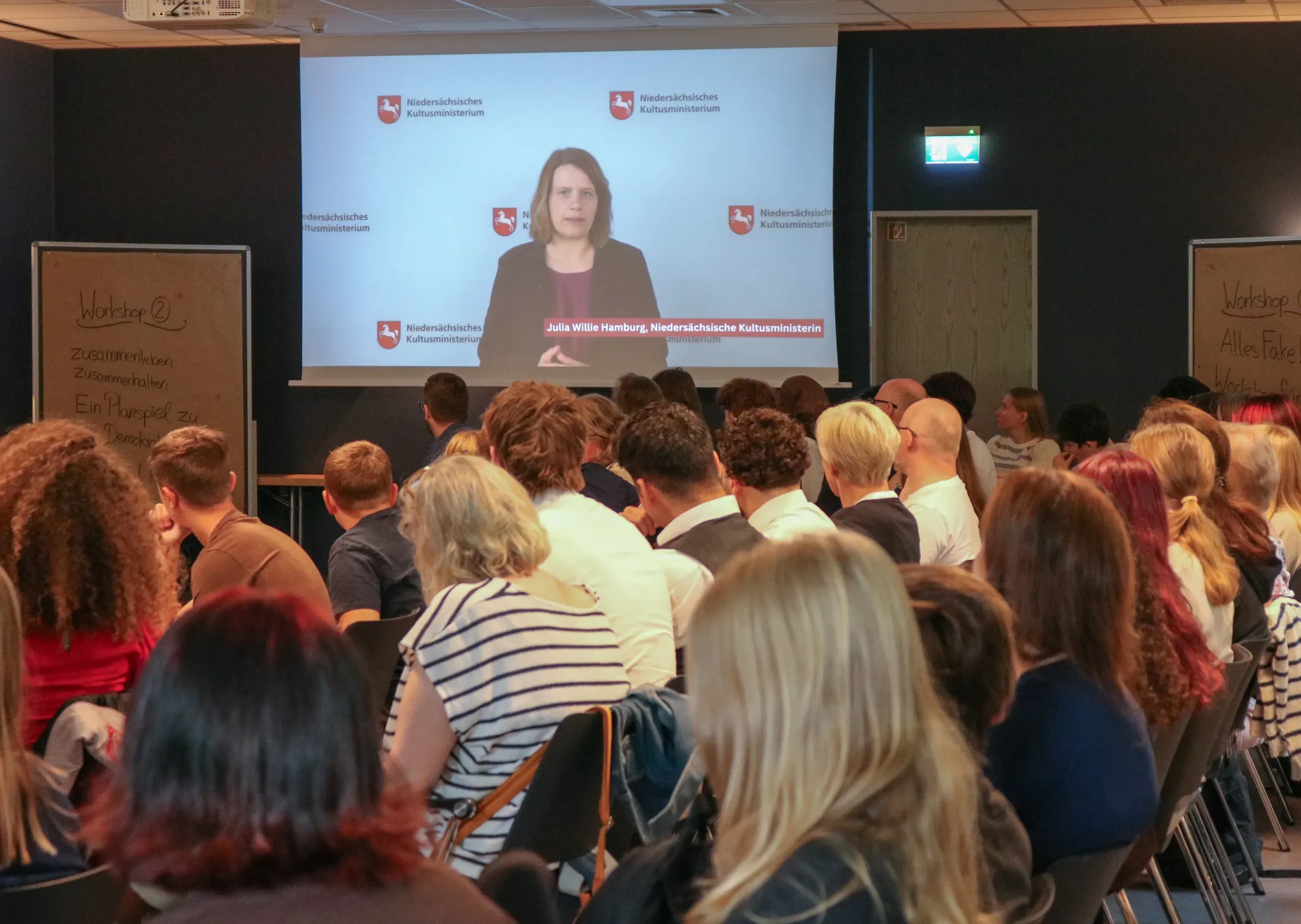 Die Niedersächsische Kultusministerin Julia Willie Hamburg leitete die Veranstaltung mit einem ausführlichen Grußwort ein. „Schulen sind der zentrale Ort, an dem unsere Demokratie langfristig gesichert werden kann. Hier lernen Schülerinnen und Schüler, sich zu beteiligen, demokratische Werte anzueignen und gemeinsam pluralistisches Lernen und Leben zu gestalten. Lehrkräfte in Niedersachsen leisten hier tagtäglich enorm wichtige Arbeit für die Demokratiebildung – dabei müssen sie kontroverse Themen diskutieren, demokratisches Handeln fördern und manchmal auch menschen- oder demokratiefeindlichen Aussagen widersprechen“, betont Kultusministerin Julia Willie Hamburg. „Bereits in den letzten Jahren haben wir ihnen dabei immer wieder den Rücken gestärkt. Mit den Demokratie-Camps schaffen wir gezielte regionale Angebote für Schülerinnen und Schüler. Die neuen Handreichungen geben erneut Handlungssicherheit für Lehrkräfte bei antidemokratischen Positionen und zeigen Best-Practice-Modelle für Demokratiebildung auf.“